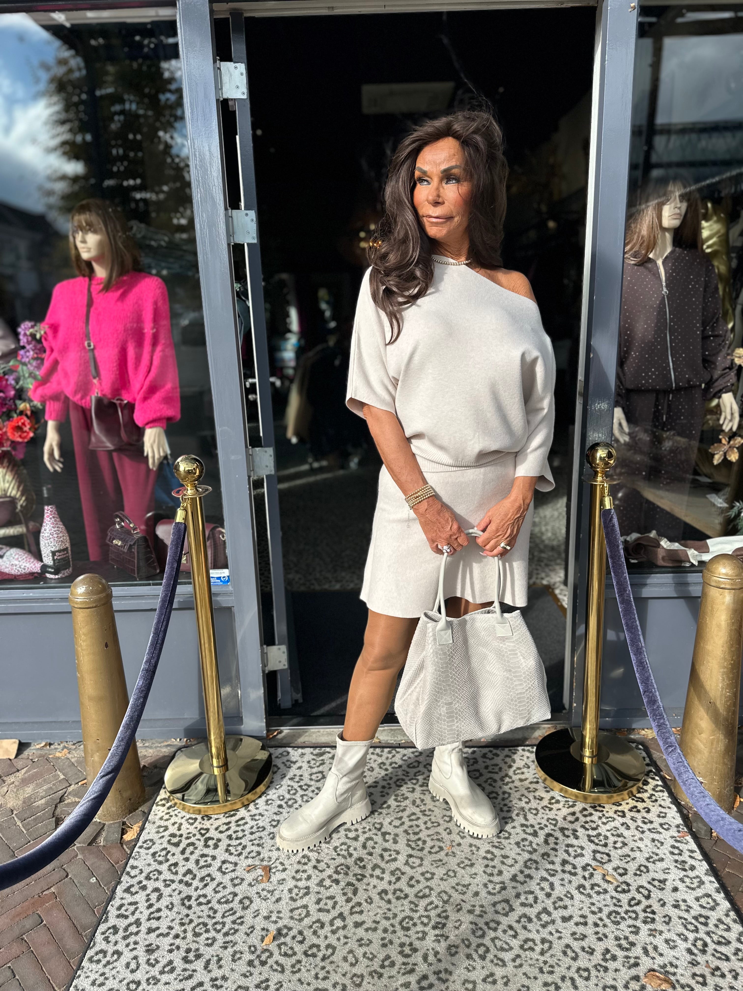 Deze trendy twee-delige set met een korte rok en bijpassende top is de perfecte combinatie van vrouwelijkheid en comfort. Gemaakt van een zachte, soepele stof die mooi valt en heerlijk aanvoelt op de huid. De flatterende pasvorm zorgt ervoor dat deze set geschikt is tot en met maat 42.