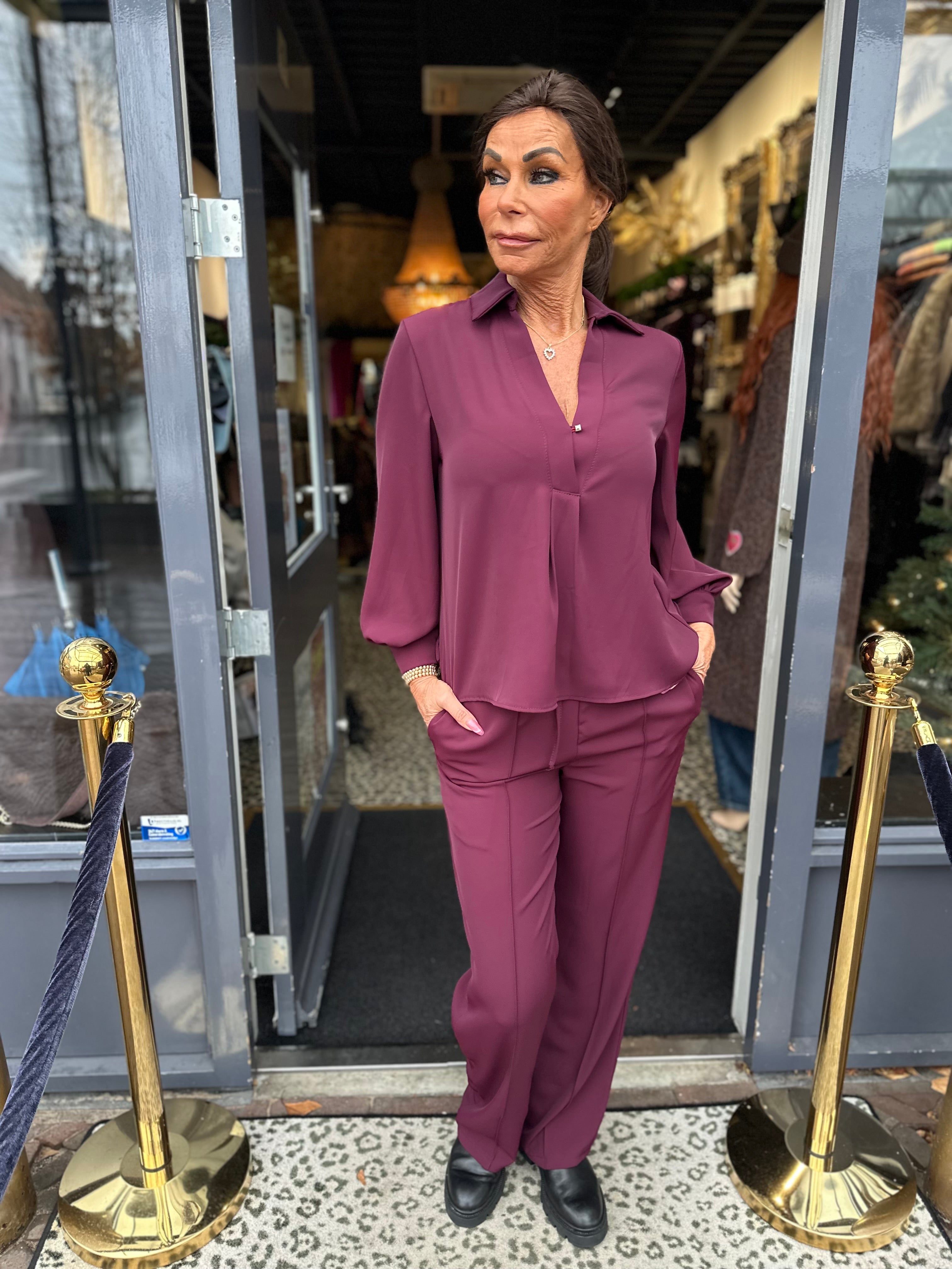 Deze prachtige 2-delige set combineert comfort met een chique uitstraling. De blouse is gemaakt van een heerlijk zachte, soepele stof en heeft een stijlvolle V-hals die het silhouet elegant accentueert. De bijpassende broek heeft een binnenbeenlengte van 75 cm en valt mooi recht voor een flatterende pasvorm.