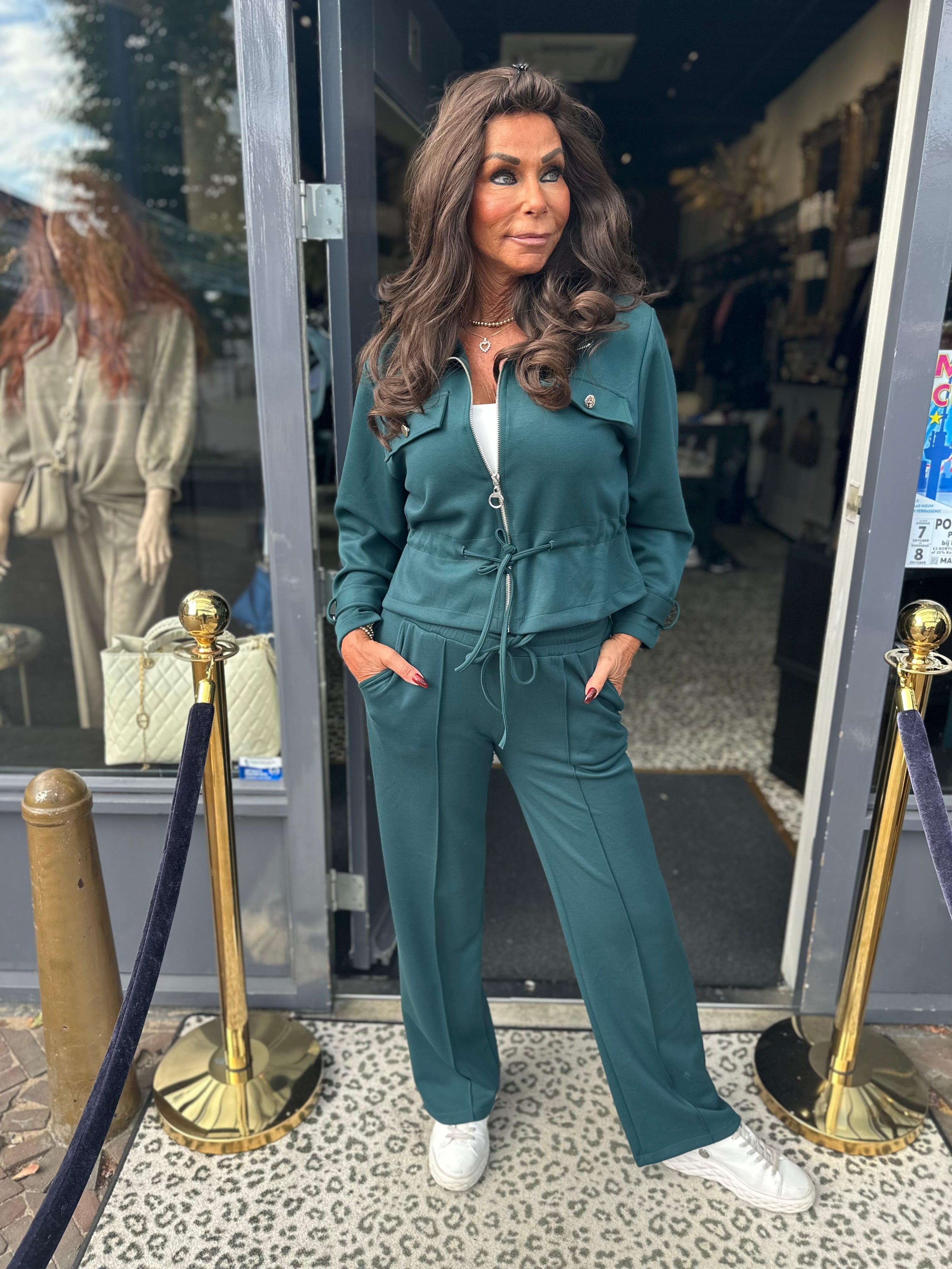 Maak kennis met onze prachtige tweedelige set, gemaakt van zachte en comfortabele stof die perfect is voor elke gelegenheid. De lange broek zorgt voor een chique silhouet, terwijl het bijpassende jasje stijlvolle trekkoorden en elegante gouden knopen heeft voor een verfijnde touch. Omarm moeiteloze stijl en comfort met deze veelzijdige outfit die moeiteloos van dag naar nacht overgaat. Verrijk je garderobe vandaag nog!