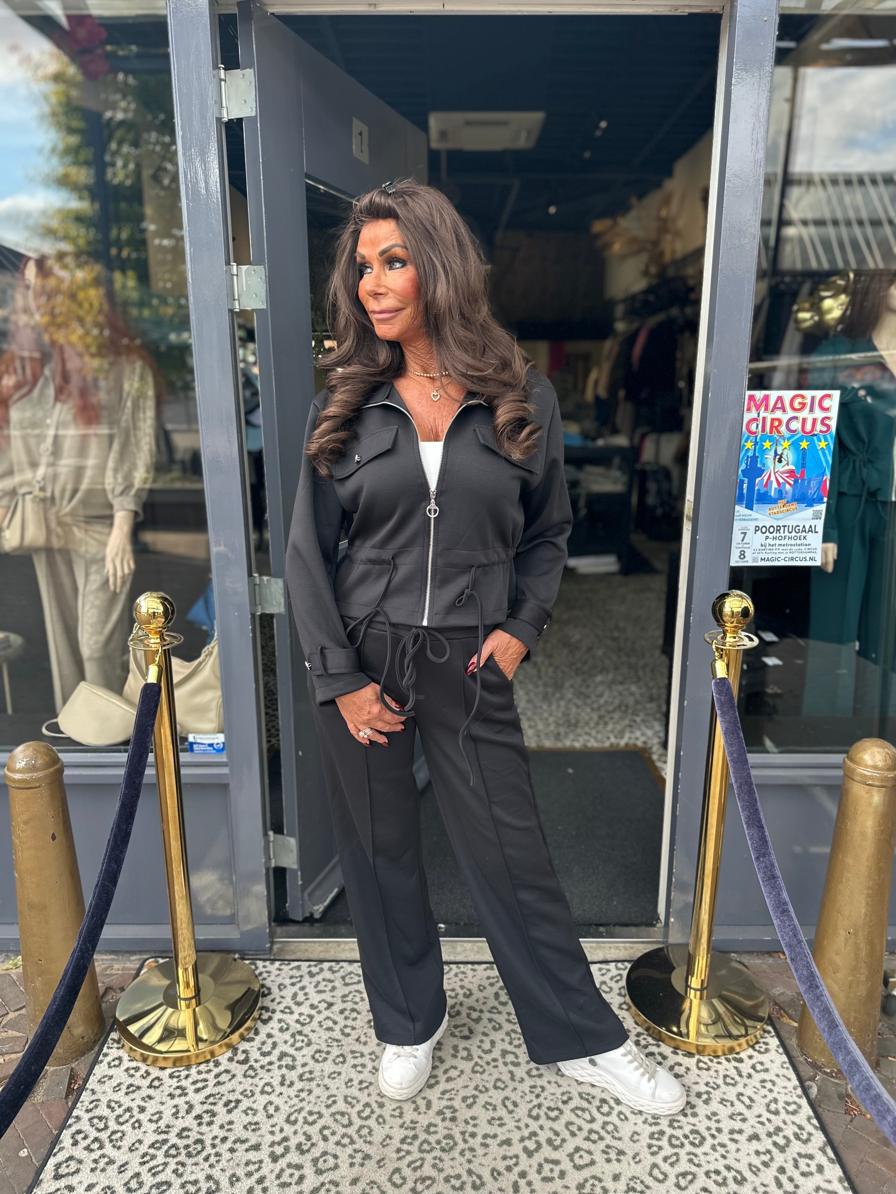 Maak kennis met onze prachtige tweedelige set, gemaakt van zachte en comfortabele stof die perfect is voor elke gelegenheid. De lange broek zorgt voor een chique silhouet, terwijl het bijpassende jasje stijlvolle trekkoorden en elegante gouden knopen heeft voor een verfijnde touch. Omarm moeiteloze stijl en comfort met deze veelzijdige outfit die moeiteloos van dag naar nacht overgaat. Verrijk je garderobe vandaag nog!