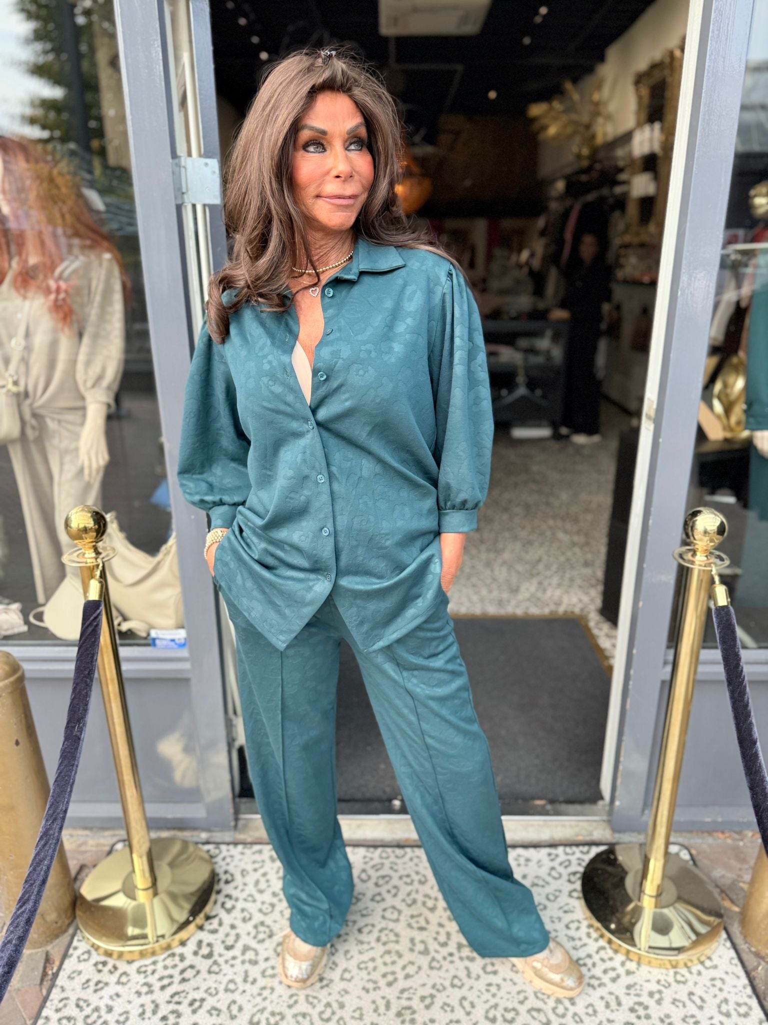 Maak kennis met onze prachtige tweedelige set, gemaakt van zachte en comfortabele stof die perfect is voor elke gelegenheid. De lange broek zorgt voor een chique silhouet, terwijl de bijpassende blouse knopen heeft voor een verfijnde touch. Omarm moeiteloze stijl en comfort met deze veelzijdige outfit die moeiteloos van dag naar nacht overgaat. Verrijk je garderobe vandaag nog!