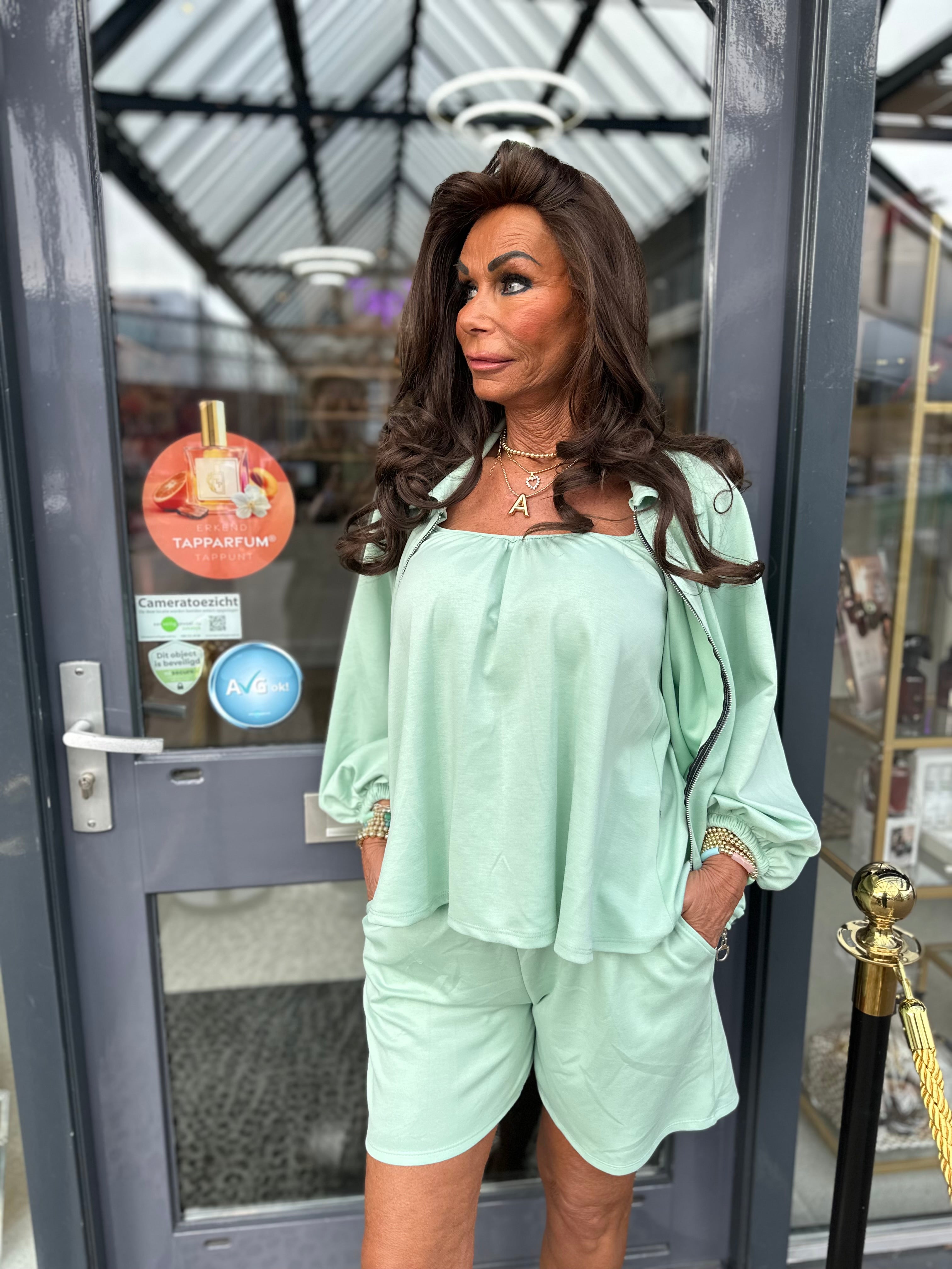 Ontdek ons prachtige 3-delige set "Made my day" in paars. Dit elegante ensemble bestaat uit een stijlvol jasje, een kort broekje en een verfijnde top, allemaal gemaakt van super zachte en hoogwaardige stof. Perfect voor een complete look met comfort en klasse. Ideaal voor dagelijks dragen of speciale gelegenheden.