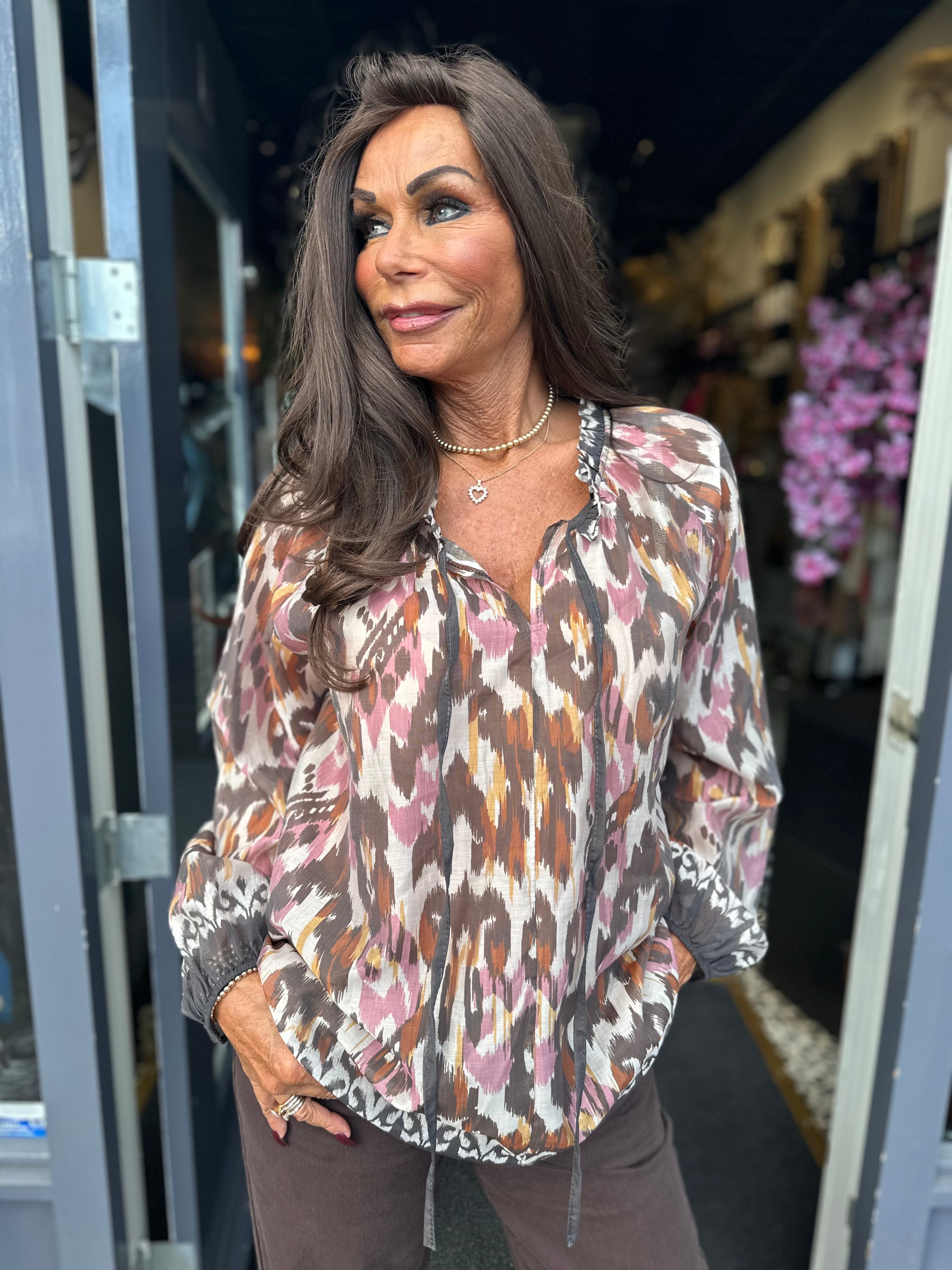 Ontdek onze prachtige blouse met elastische mouwen en een verleidelijke V-hals, versierd met delicate koorden. Deze blouse verenigt stijl en comfort en is perfect voor elke gelegenheid, of het nu op kantoor is of tijdens een avondje uit. De elastische mouwen zorgen voor een comfortabele pasvorm, terwijl de V-hals uw look een elegante touch geeft. Combineer het met jeans of een rok en maak een modieus statement!