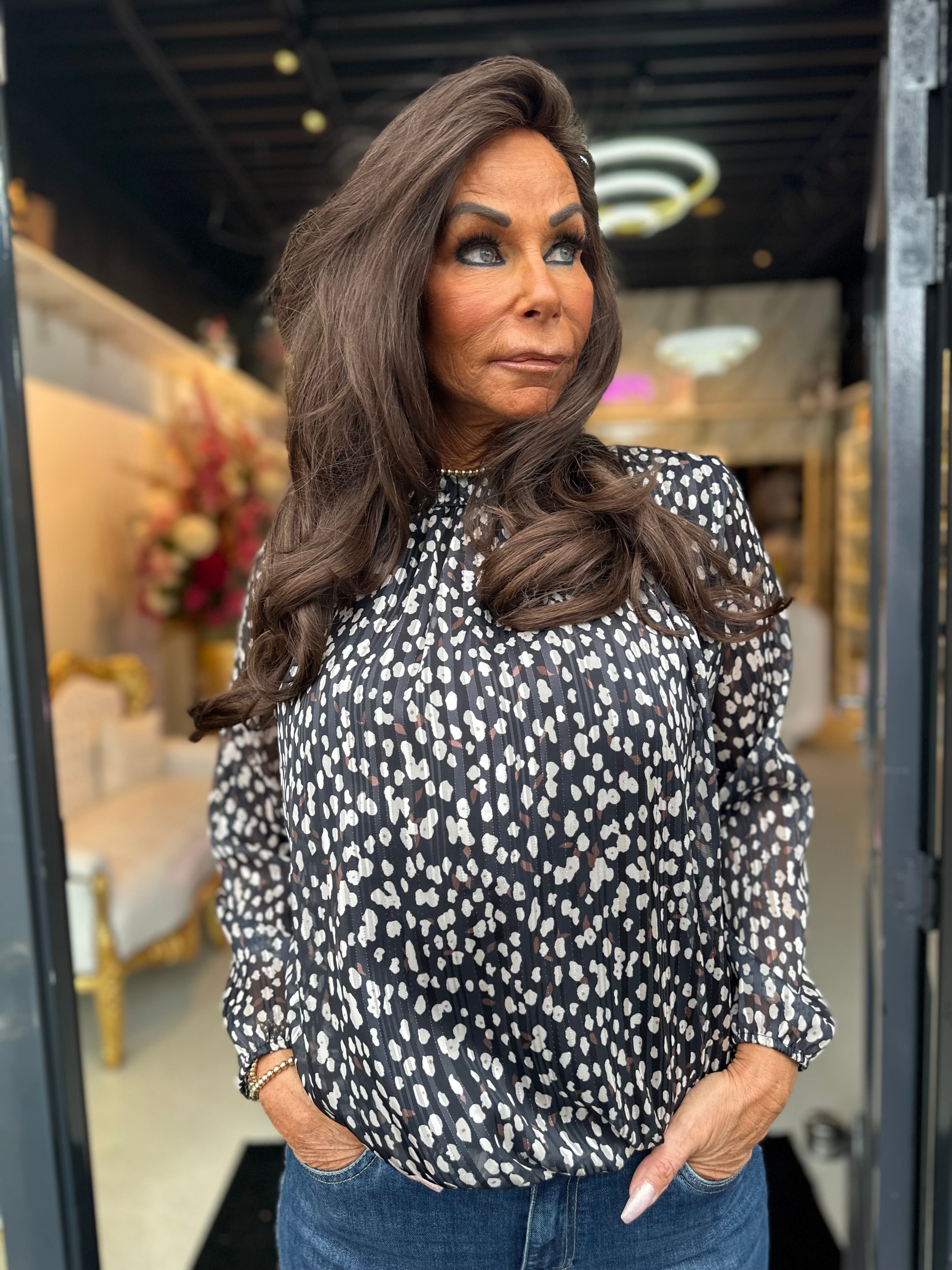 Ontdek onze prachtige blouse, die versierd is met delicate ruches aan de mouwen en elegante print! Deze blouse verenigt stijl en comfort en is perfect voor elke gelegenheid, of het nu op kantoor is of tijdens een avondje uit. Combineer hem met je favoriete jeans of een chique rok en maak een modieus statement!