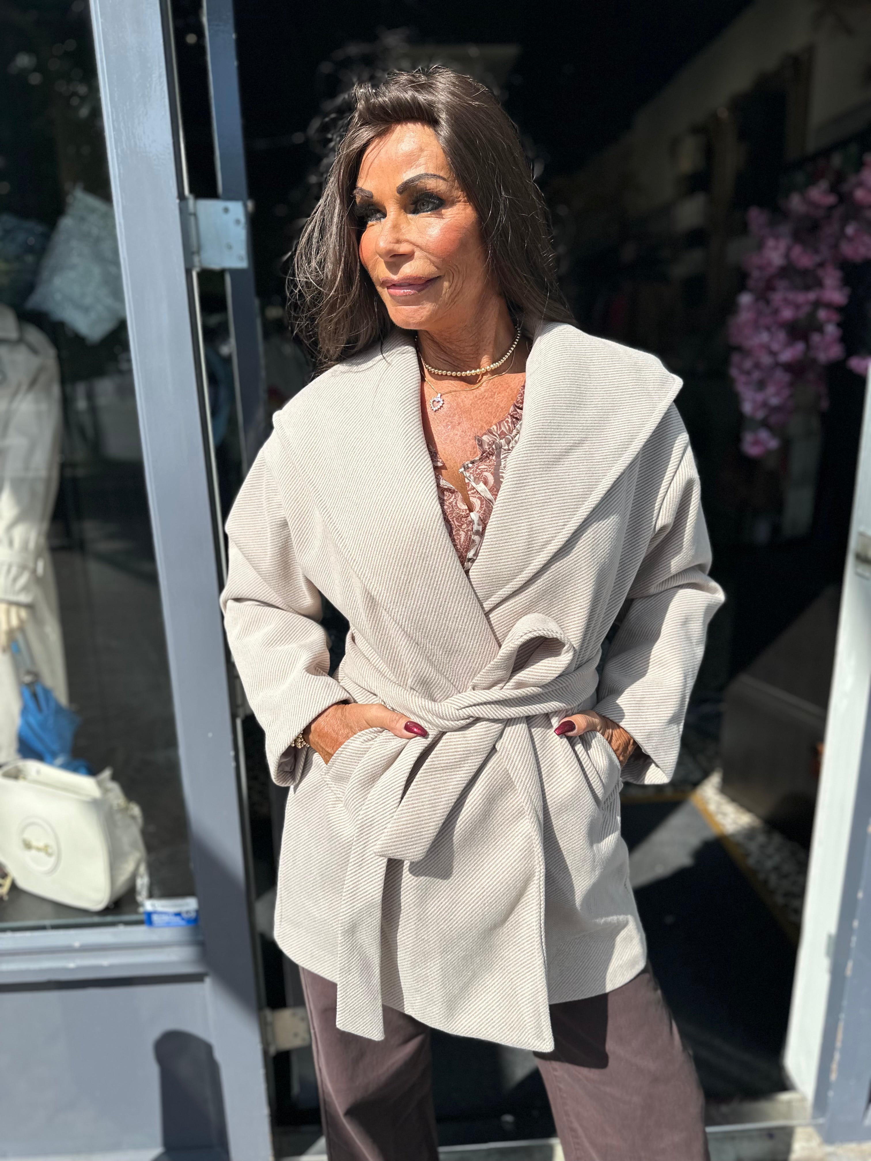 Ontdek onze prachtige jasje met praktische zakken en een gezellige capuchon. De elastische inzet op de achterkant zorgt voor een flatterende taille, terwijl de stijlvolle riem extra flair toevoegt. Helemaal zonder knopen of ritsen is dit jasje niet alleen comfortabel, maar ook super eenvoudig te dragen. Perfect voor elke gelegenheid!