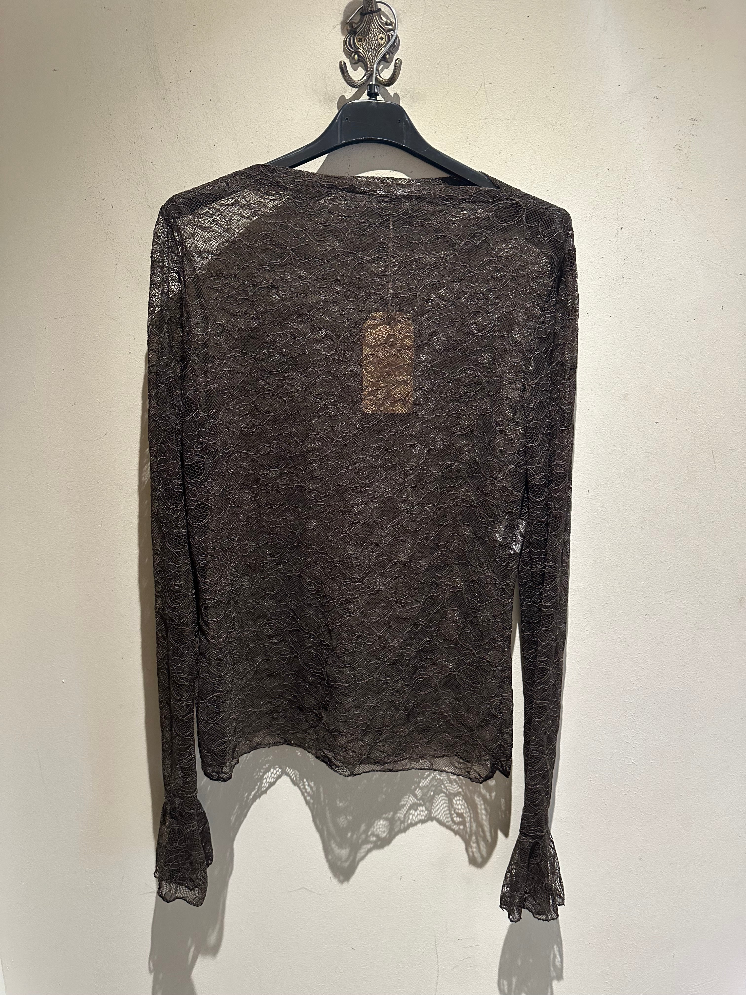 Deze prachtige kanten blouse met vloeiende mouwen is een absolute must-have voor elke garderobe. De hals kan...
