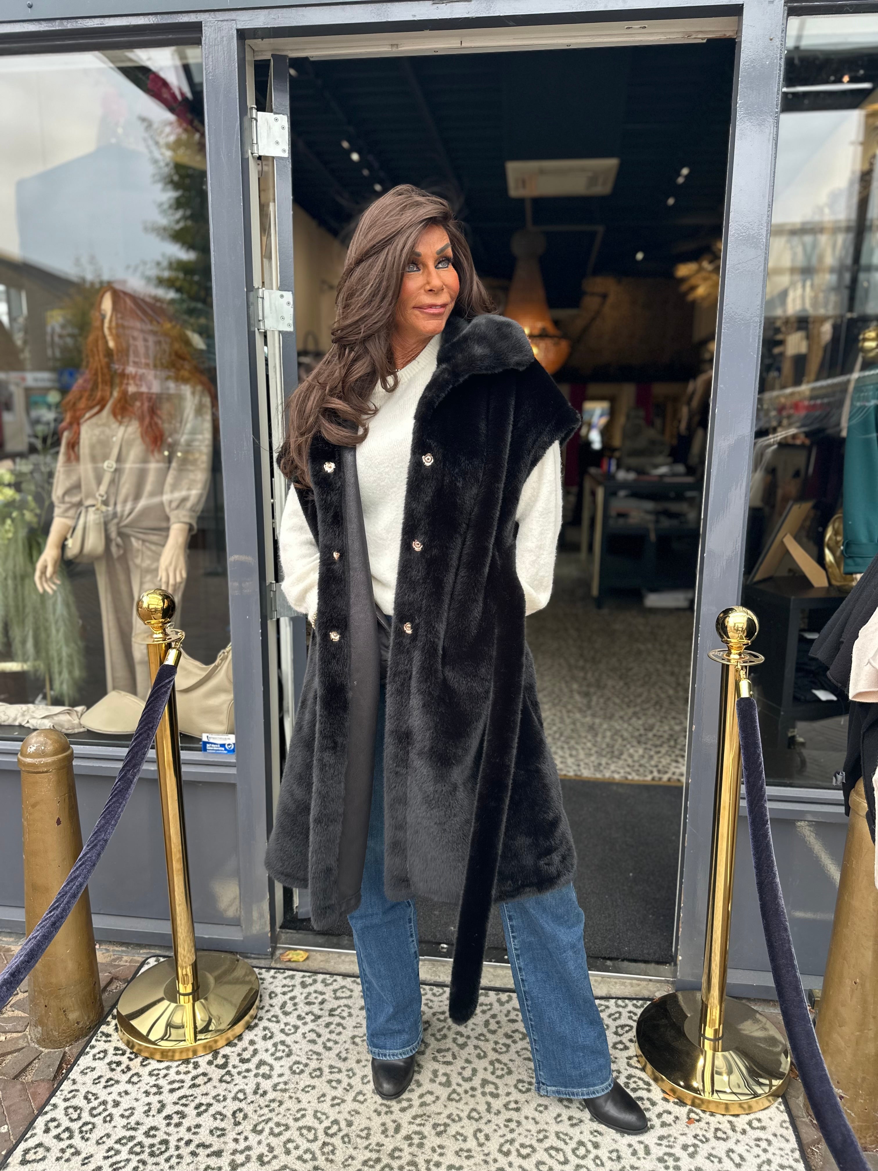 Ontdek onze prachtige kunstbont gilet, die is uitgerust met drukknoopsluitingen en praktische zakken. Deze stijlvolle en gezellige...