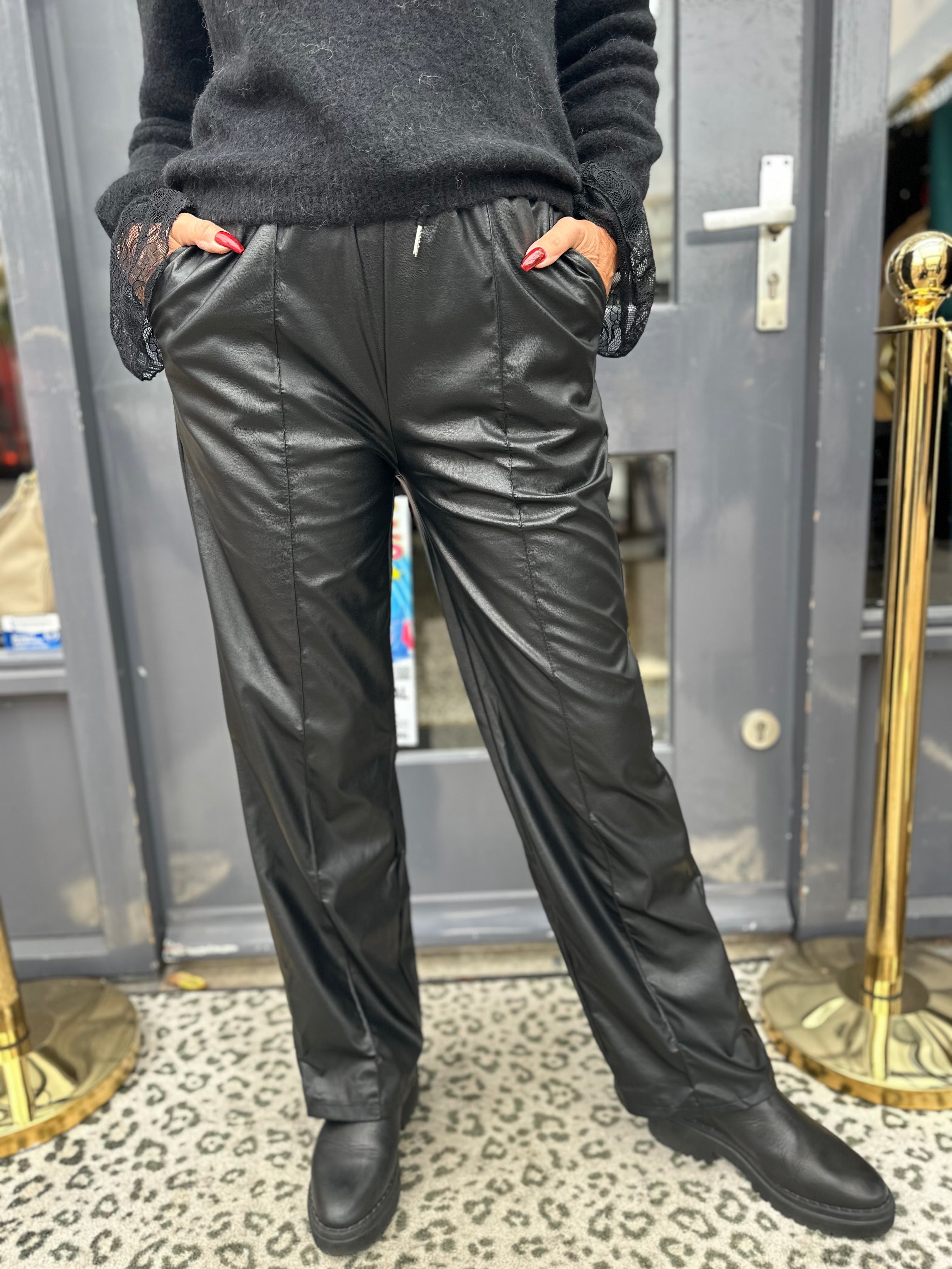 Deze mooie leren-look broek overtuigt met zijn elastische tailleband en biedt veel stretch voor optimaal draagcomfort. Het wordt aanbevolen om de broek iets strakker te kiezen voor de perfecte pasvorm. Ideaal voor een modieuze uitstraling!