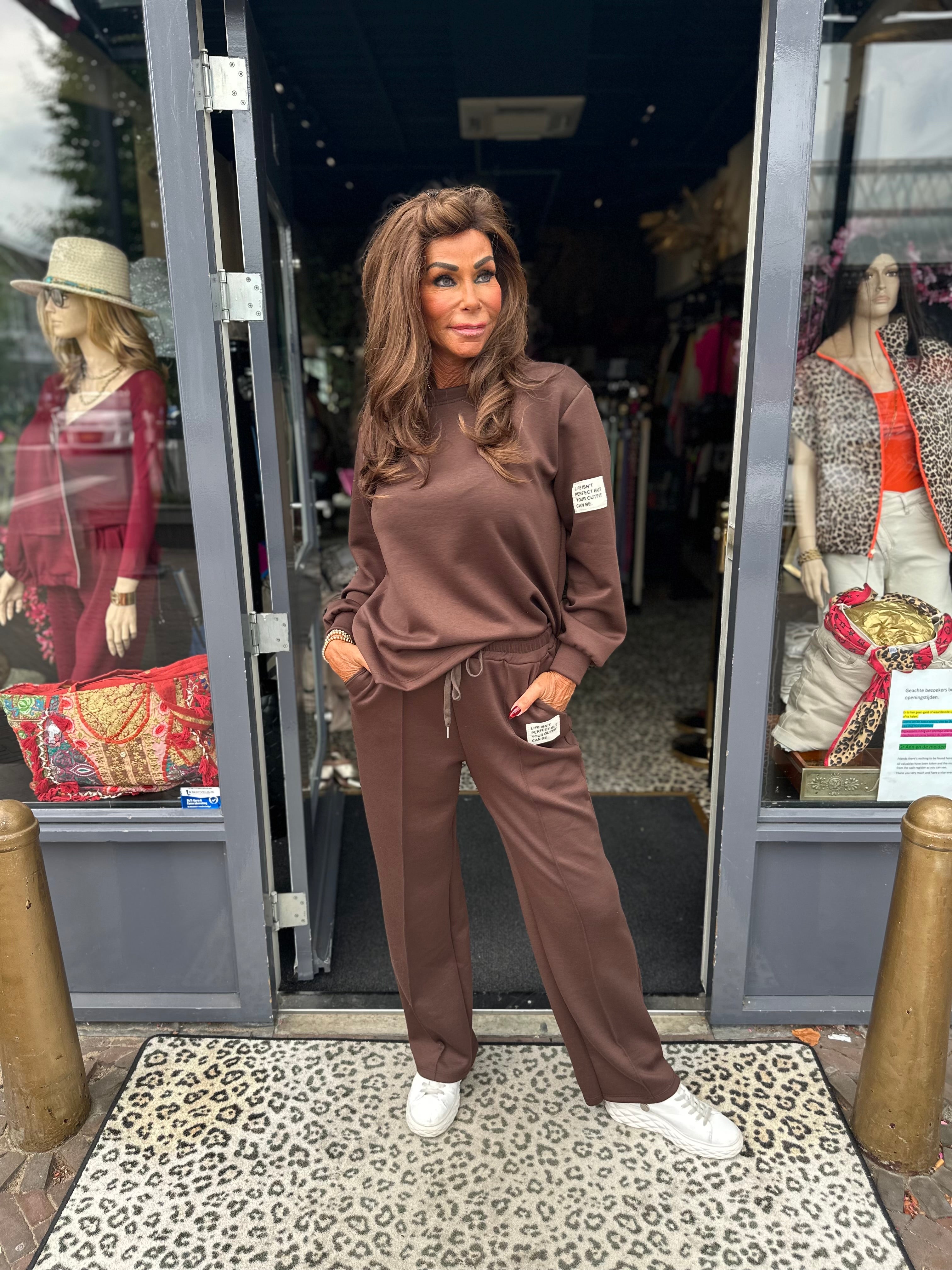 Ontdek onze stijlvolle 2-delige set, bestaande uit een comfortabele lange broek en een casual lange mouwen top. Met de inspirerende uitspraak "Het leven is niet perfect, maar je outfit kan dat wel zijn" op de emblemen breng je niet alleen mode, maar ook een positieve houding in je dagelijks leven. Ideaal voor ontspannen dagen of als modieus statement – deze set verenigt comfort en stijl op perfecte wijze!