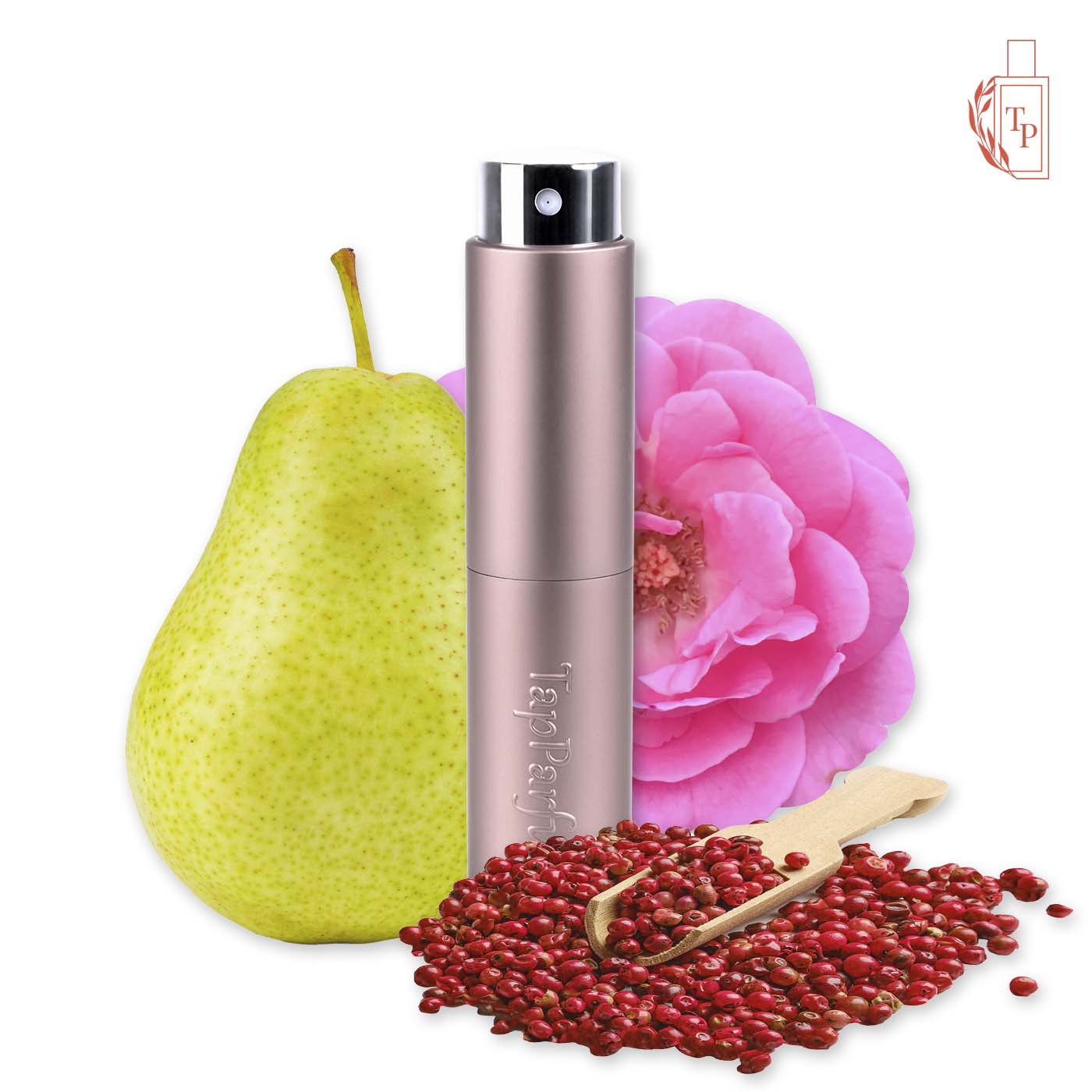 De gehele olfactorische pyramide, het sillage die gegradeerd is als midden, en de duidelijkst waarneembare geurnoten damask roos, peer, roze peper, maken dit een parfum die perfect is voor Lente, Zomer.
