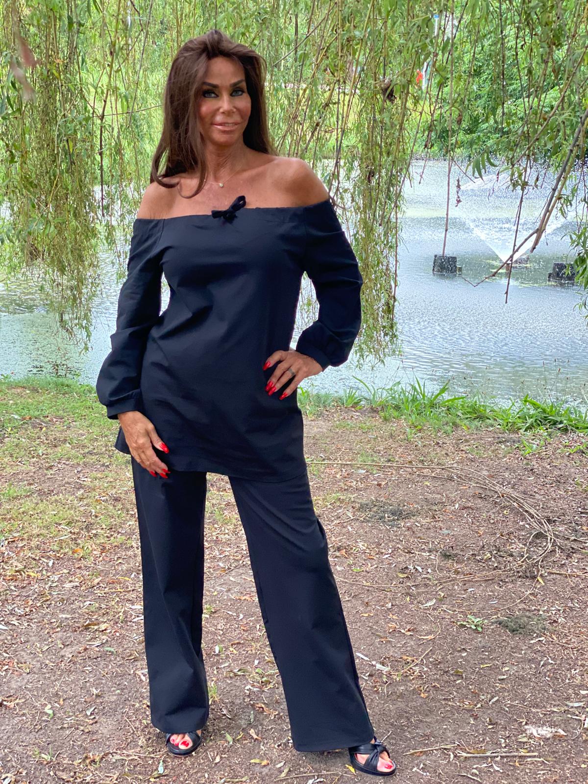 De “Angelique” set bestaat uit een elegant bovenstuk en een bijpassende broek die je gemakkelijk kunt mixen en matchen met je bestaande garderobe. Het bovenstuk heeft een innovatief ontwerp zonder elastiek aan de hals, waardoor je het op drie manieren kunt dragen: off shoulder voor een flirterige uitstraling, one shoulder voor een modieuze twist, of als een klassieke ronde hals voor een tijdloze look. De rechte mouwen maken het eenvoudig om het bovenstuk te combineren met een jasje of bodywarmer, zodat je altijd klaar bent voor elke gelegenheid.